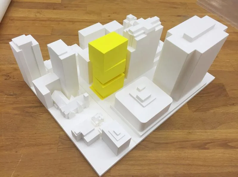 Этот этап называется массингом — формированием объёмной модели будущей застройки из простых геометрических форм. Массинг задаёт общие пропорции, высотность, ритм застройки и логику размещения зданий, ещё до детальной архитектуры и фасадов.