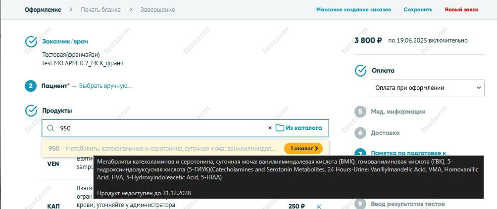 Новый заказ: изменение заказчика, добавление продуктов в корзину, настройка доставки результатов, заполнение медицинской информации и опросников, передача информации пациенту, вывод рекомендаций, печать и подписание документов, применение правил лояльности, оплата и оформление заказа.