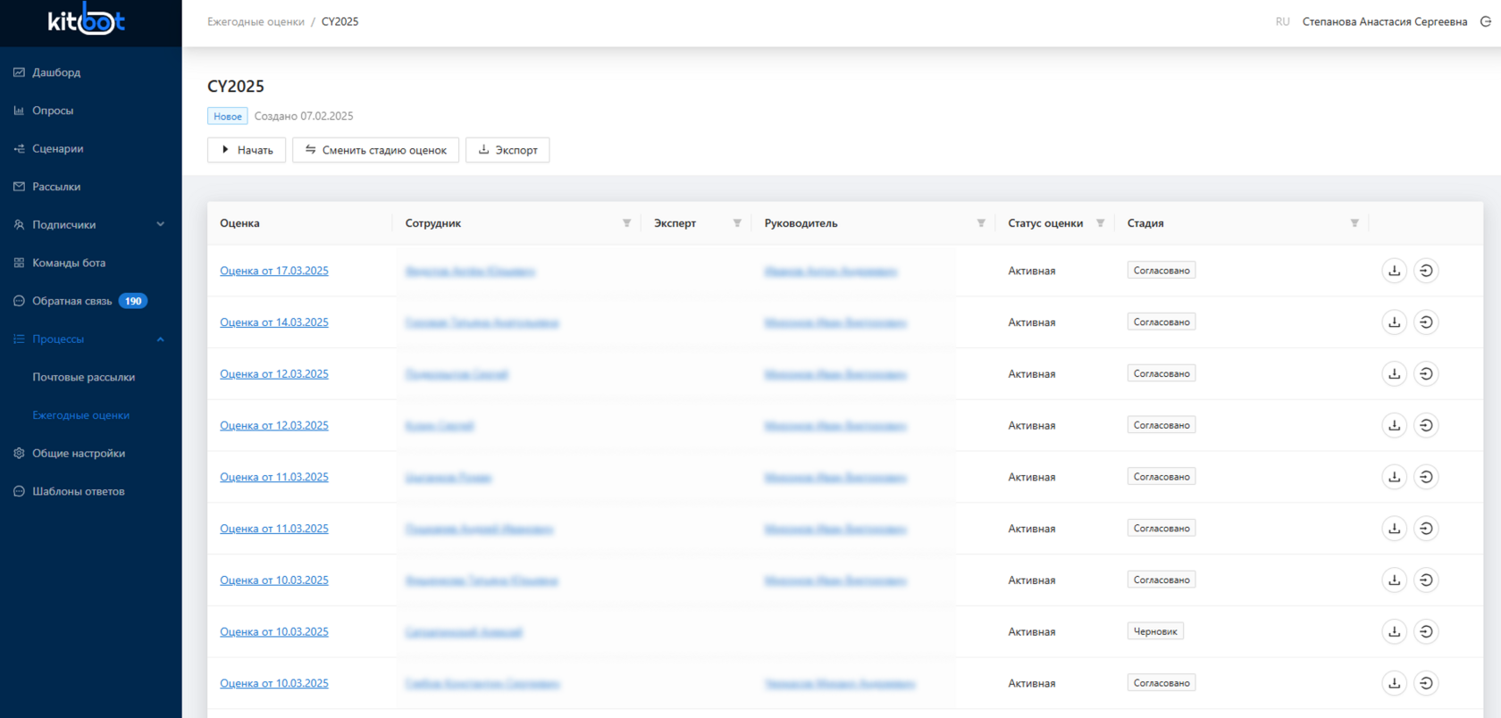 Весь процесс реализован через портал — чат-бот используется только для уведомлений и напоминаний в зависимости от роли пользователя. Из административной панели HR может выгрузить список сотрудников и их оценки для аналитики и отчётности.