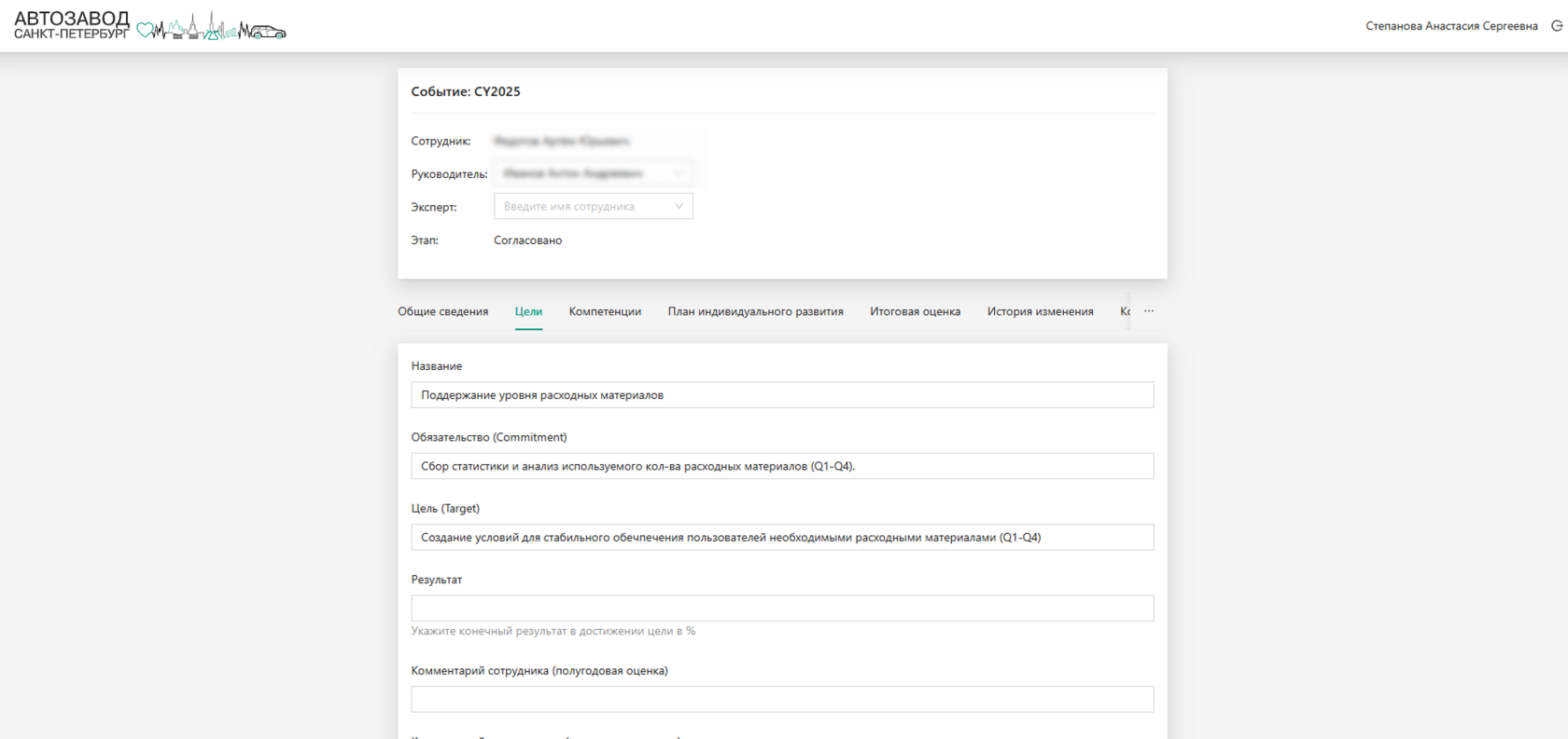 В начале года каждый сотрудник формулирует свои цели на год. В зависимости от должности это могут быть задачи по снижению простоев на линии, запуску нового проекта или улучшению показателей качества. Руководитель видит цели в системе и согласовывает их.