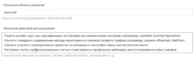 Помимо конкретных целей, в карточке оцениваются компетенции, включая софт-скиллы по матрице компетенций. Сотрудник и руководитель отмечают их аналогично целям.