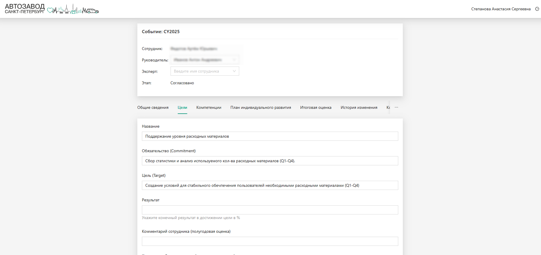 В начале года каждый сотрудник формулирует свои цели на год. В зависимости от должности это могут быть задачи по снижению простоев на линии, запуску нового проекта или улучшению показателей качества. Руководитель видит цели в системе и согласовывает их.