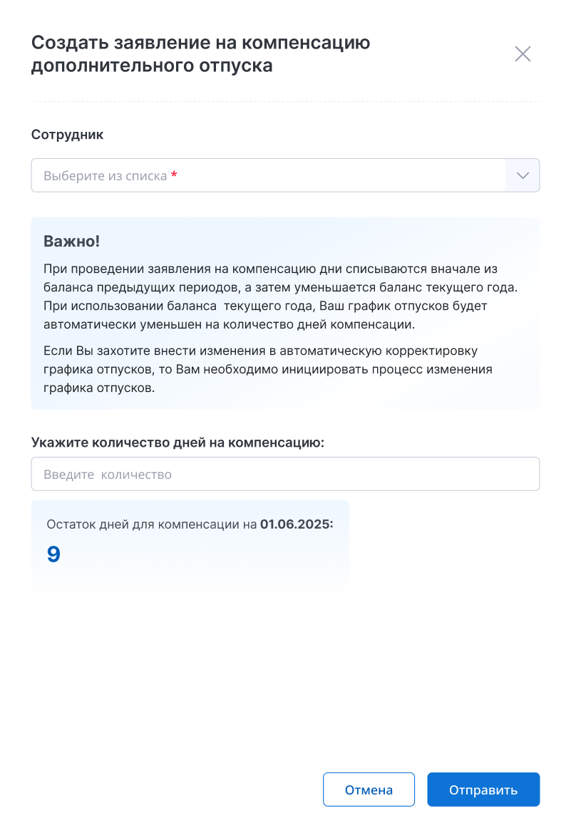Сотрудники получают уведомление о начале планирования графика отпусков на следующий год. В интерфейсе системы пользователи видят остаток доступных дней, выбирают желаемые даты отпуска и отправляют на согласование.