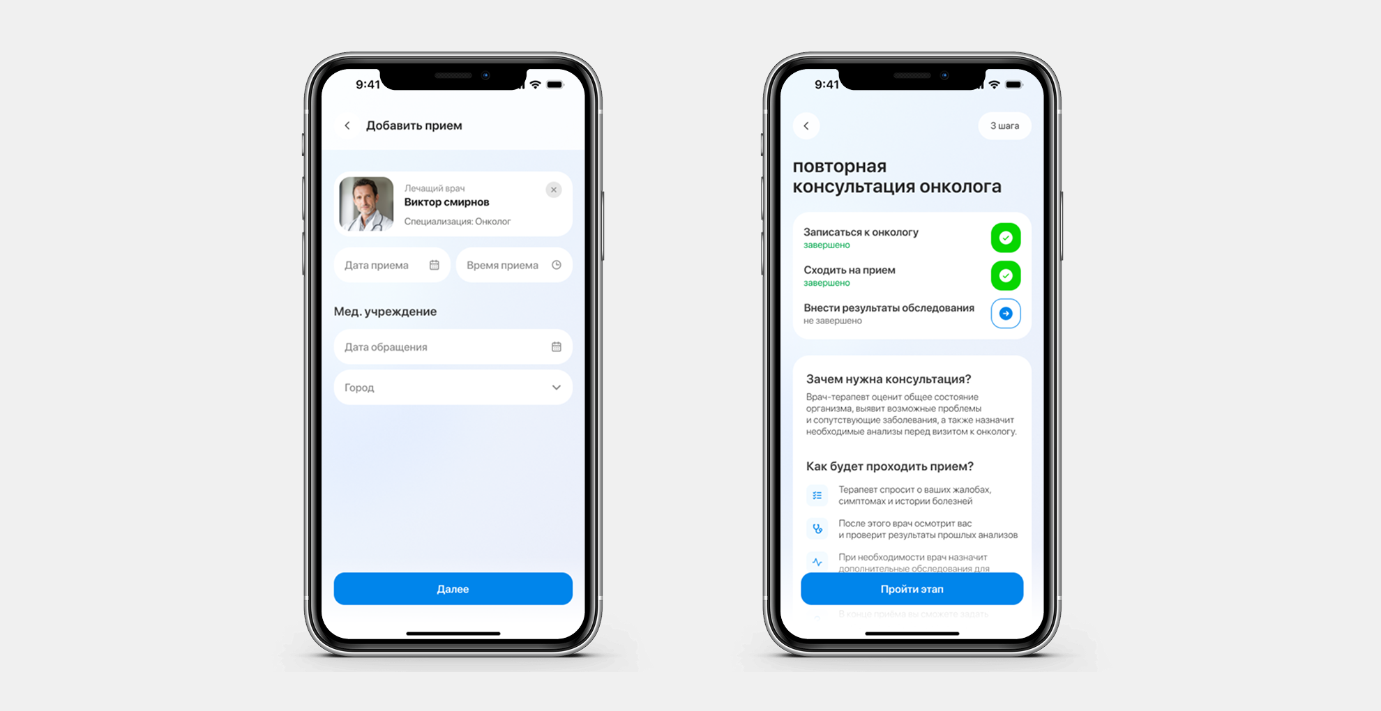 UI-дизайн включал создание визуальной системы, которая делает информацию максимально читаемой: понятные статусы приёмов с цветовой маркировкой, карточка пациента с приоритетом важных данных, логичная структура уведомлений.
