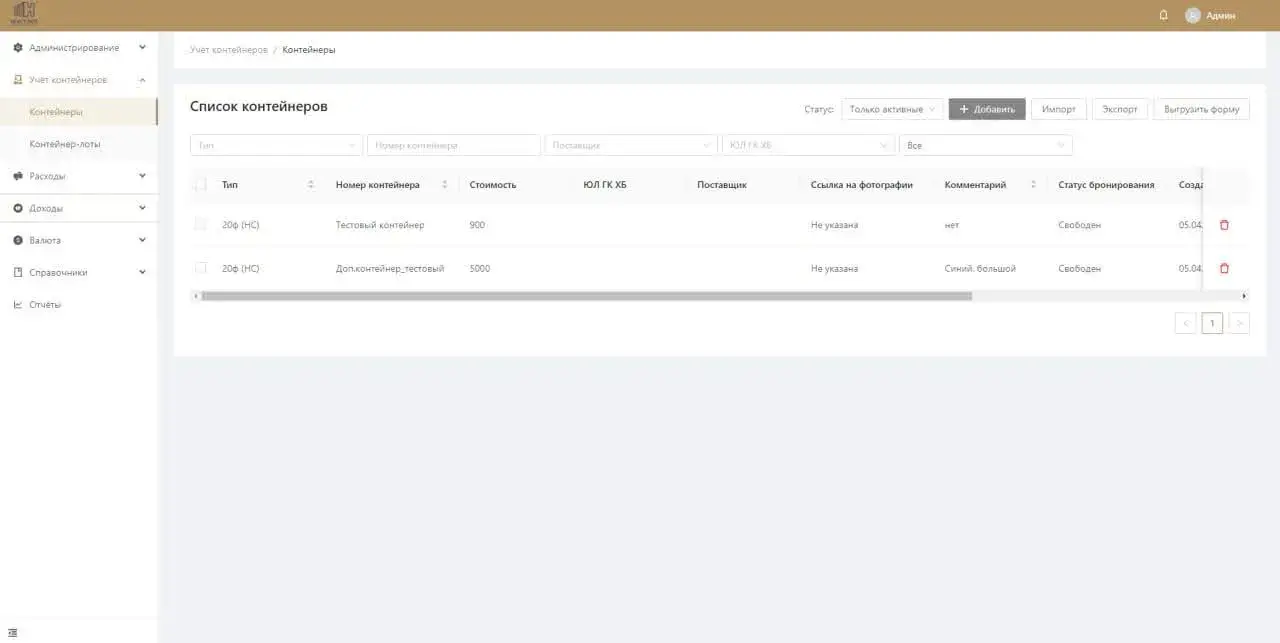 Контейнеры заносятся в реестр двумя способами: вручную или через импорт данных. При ручном добавлении пользователь указывает тип контейнера (из справочника), номер, стоимость и другую информацию. Если контейнер был куплен в иностранной валюте, система автоматически пересчитывает стоимость в рубли с помощью встроенного конвертера валют, учитывая актуальный курс.
