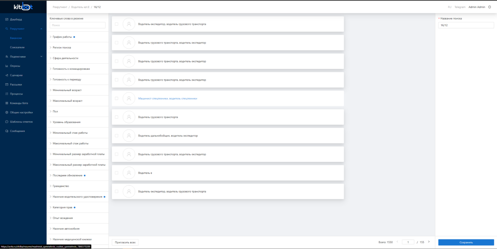 После того как кандидаты поступают в KitBot, HR может массово отправлять им приглашения на актуальные вакансии. Подходящие кандидаты проходят дальше в рабочие процессы компании.