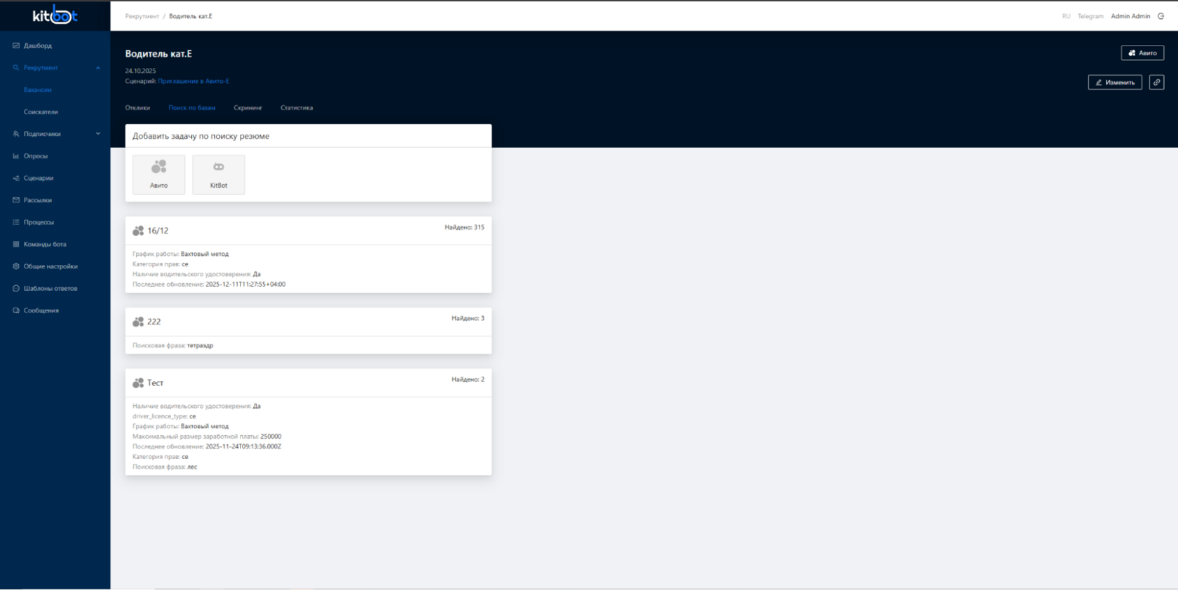 KitBot автоматически собирает данные о потенциальных кандидатах с открытых платформ, таких как Авито. Система фильтрует их по ключевым словам, навыкам и региону. Так формируется «зелёная база» — список людей, которые соответствуют основным требованиям на основании общедоступных данных.