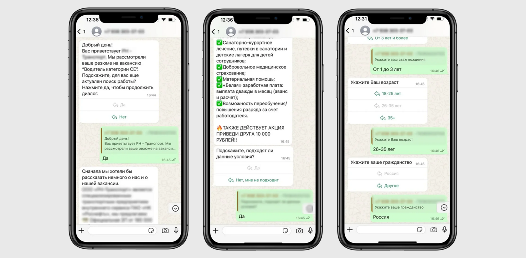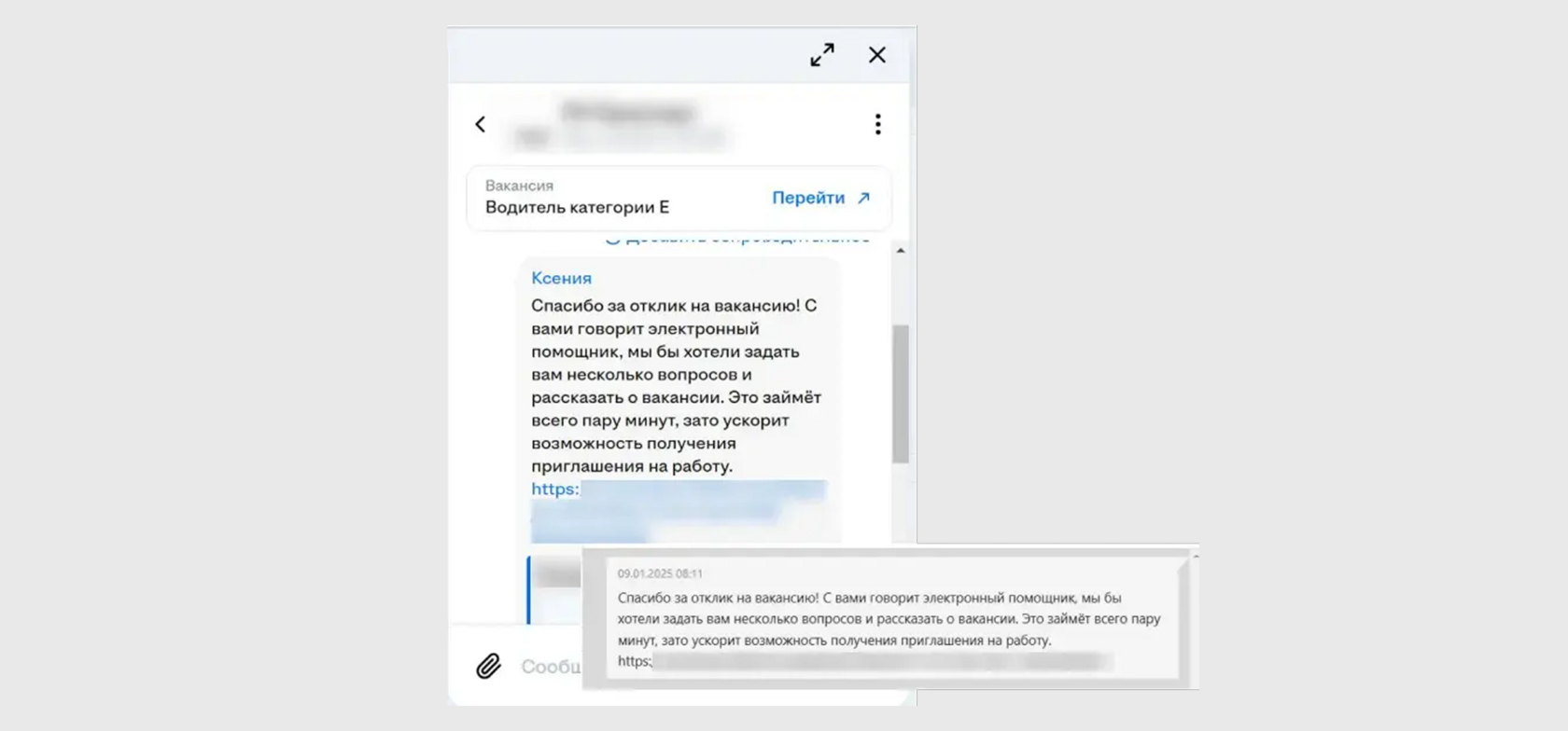 После выбора канала взаимодействия кандидаты проходят автоматическое интервью. Сценарии включают стандартные вопросы для первичной оценки, а также вопросы, касающиеся специфики вакансии: например, категория прав, стаж, наличие допусков и сертификатов и т.п.