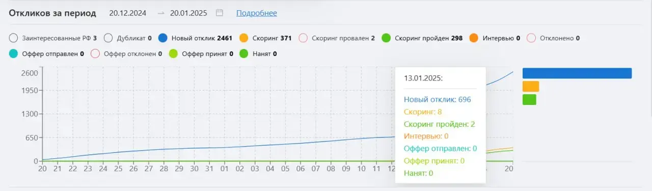 KitBot собирает данные о соискателях в разделе «Рекрутмент». В данном случае применен фильтр по статусу «Заинтересованные РФ»Аналитика за месяц
