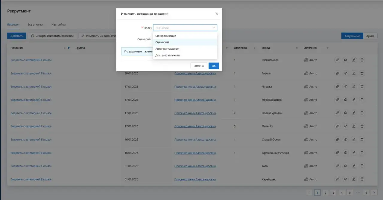Мы настроили возможность массового редактирования вакансий. Например, если требуется внести изменения в сценарии или автоприглашения можно применить сразу ко всем вакансиям этой категории. Это значительно экономит время HR-специалистов и делает управление процессом удобнее.