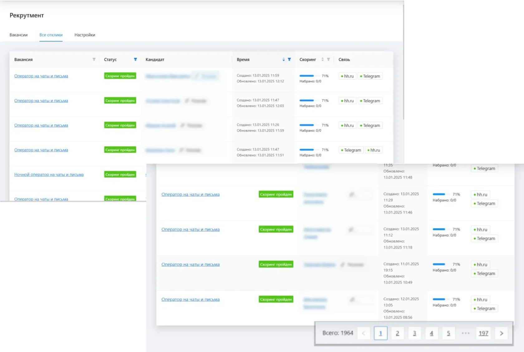 Из всего списка откликов можно настроить отображение только тех, кто успешно прошел скоринг. В данном случае этих соискателей — 1964 человека!