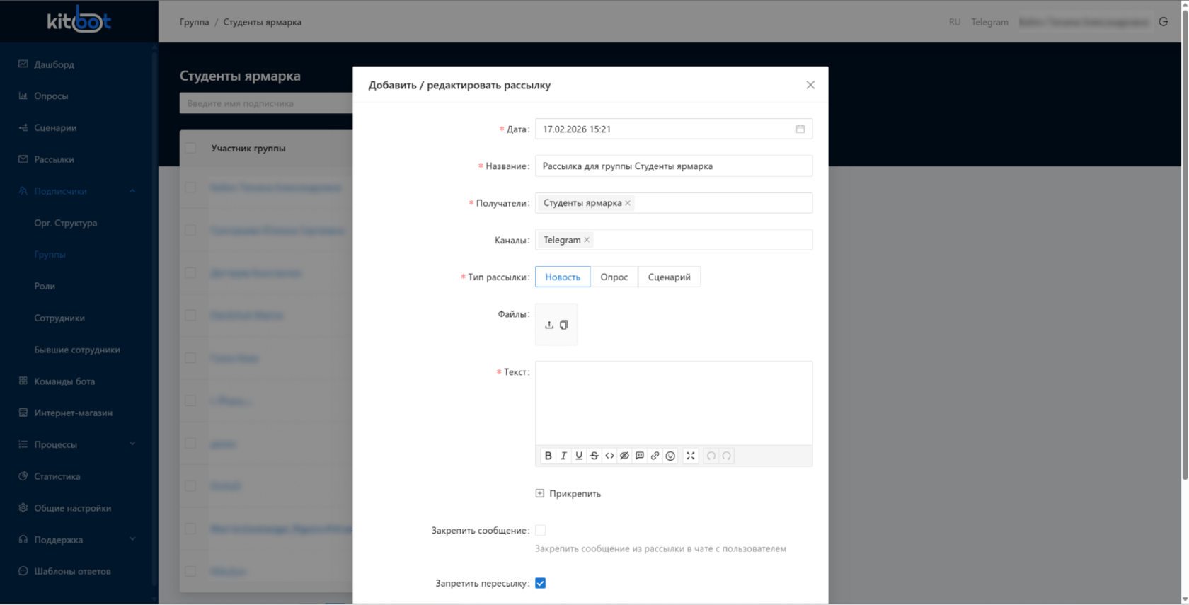 Вся коммуникация ведётся централизованно через KitBot, без ручного сбора контактов и ведения отдельных списков.