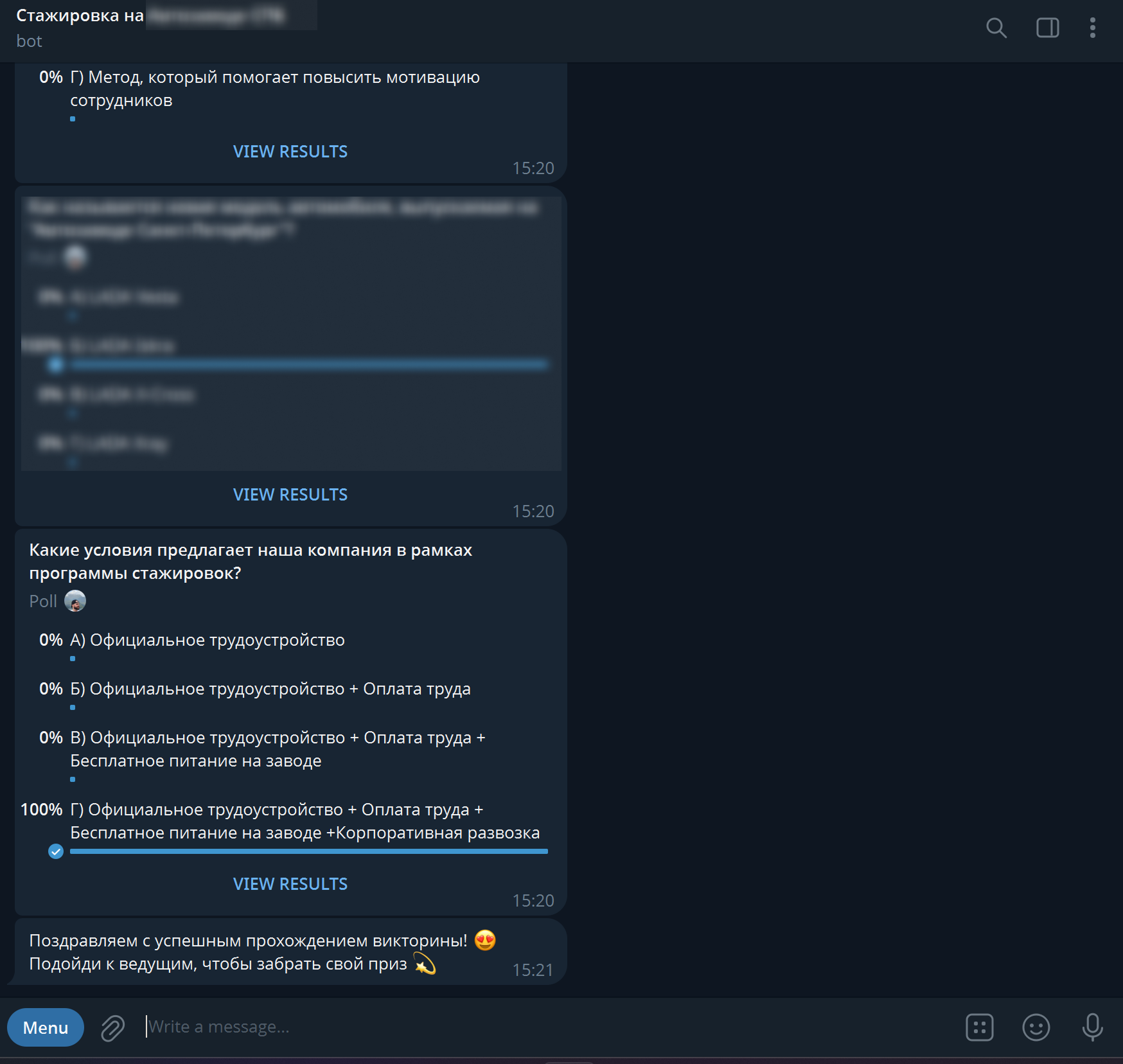 Во время мероприятия участники получают QR-код или ссылку и переходят в Telegram-бот. Бот проводит их через короткий интерактивный сценарий: участники отвечают на вопросы о компании, знакомятся с заводом и его возможностями, а также участвуют в небольшом квизе.