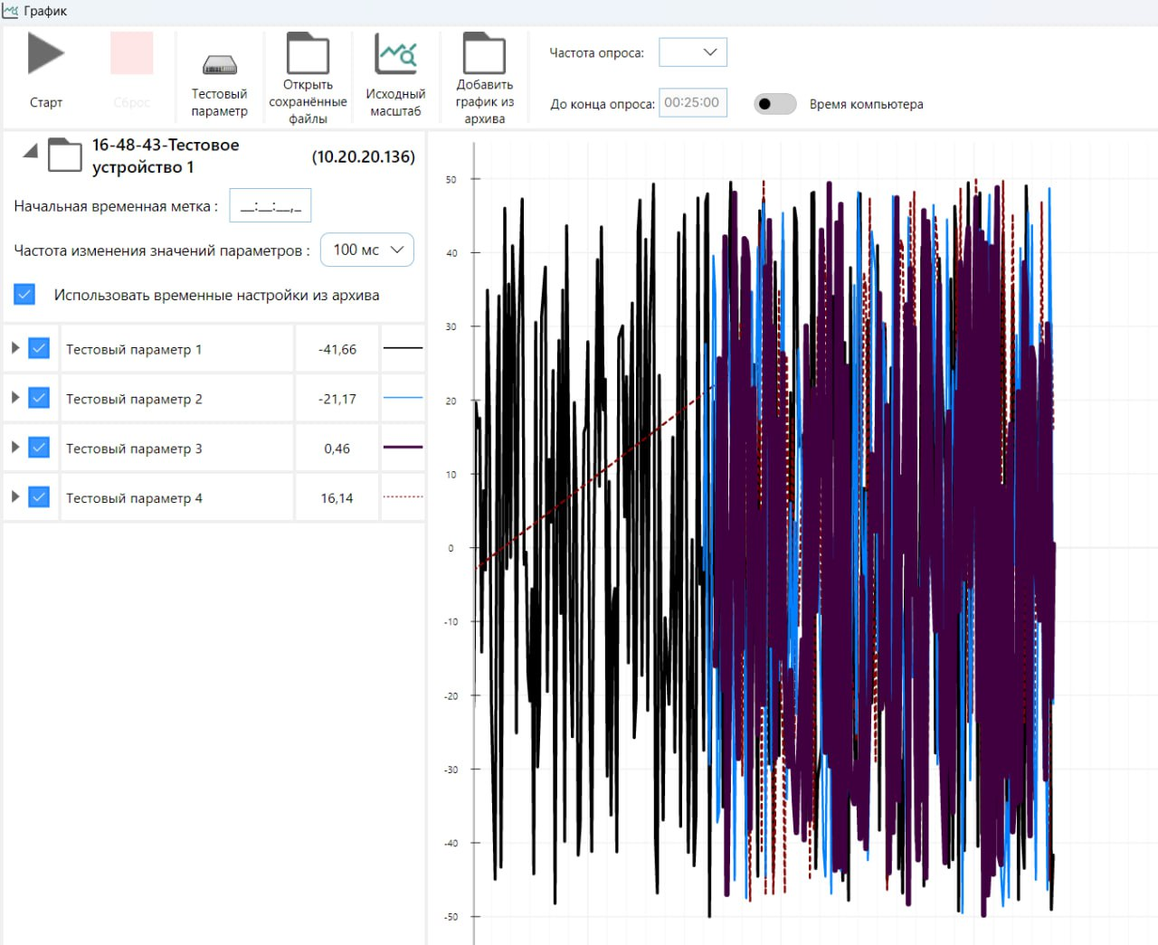 Отображение архивных данных — исторические показатели выводятся на график вместе с текущими, что облегчает анализ трендов и выявление отклонений.