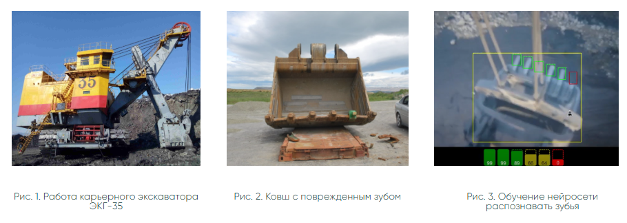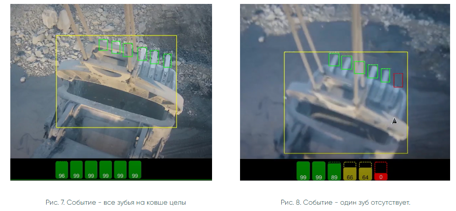 Наши специалисты установили на экскаватор камеру видеонаблюдения для контроля зубьев и неделю собирали видеозаписи с его работой в разных условиях: день, ночь, осадки, пыль в воздухе, вибрации и т.п. На основе собранных данных подобрали и обучили нейросеть, чтобы она без ошибок распознавала целостность зубьев на экскаваторе ЭКГ-35 и их износ. Проверили работу нейросети по распознаванию зубьев на других экскаваторах и на разных моделях ковшей. Нейронная сеть корректно определяла зубья во всех случаях. Это позволило нам с уверенностью говорить о потенциальной успешности сдачи проекта.