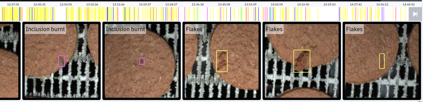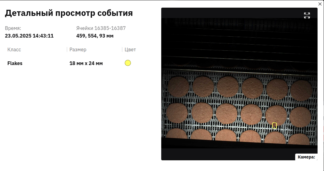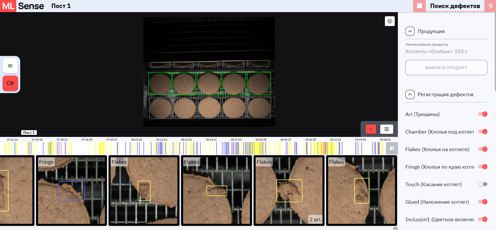 Оператор видит все события в удобном интерфейсе. Каждое срабатывание фиксируется в ленте, хранится фото- и видеофрагмент дефектной котлеты.