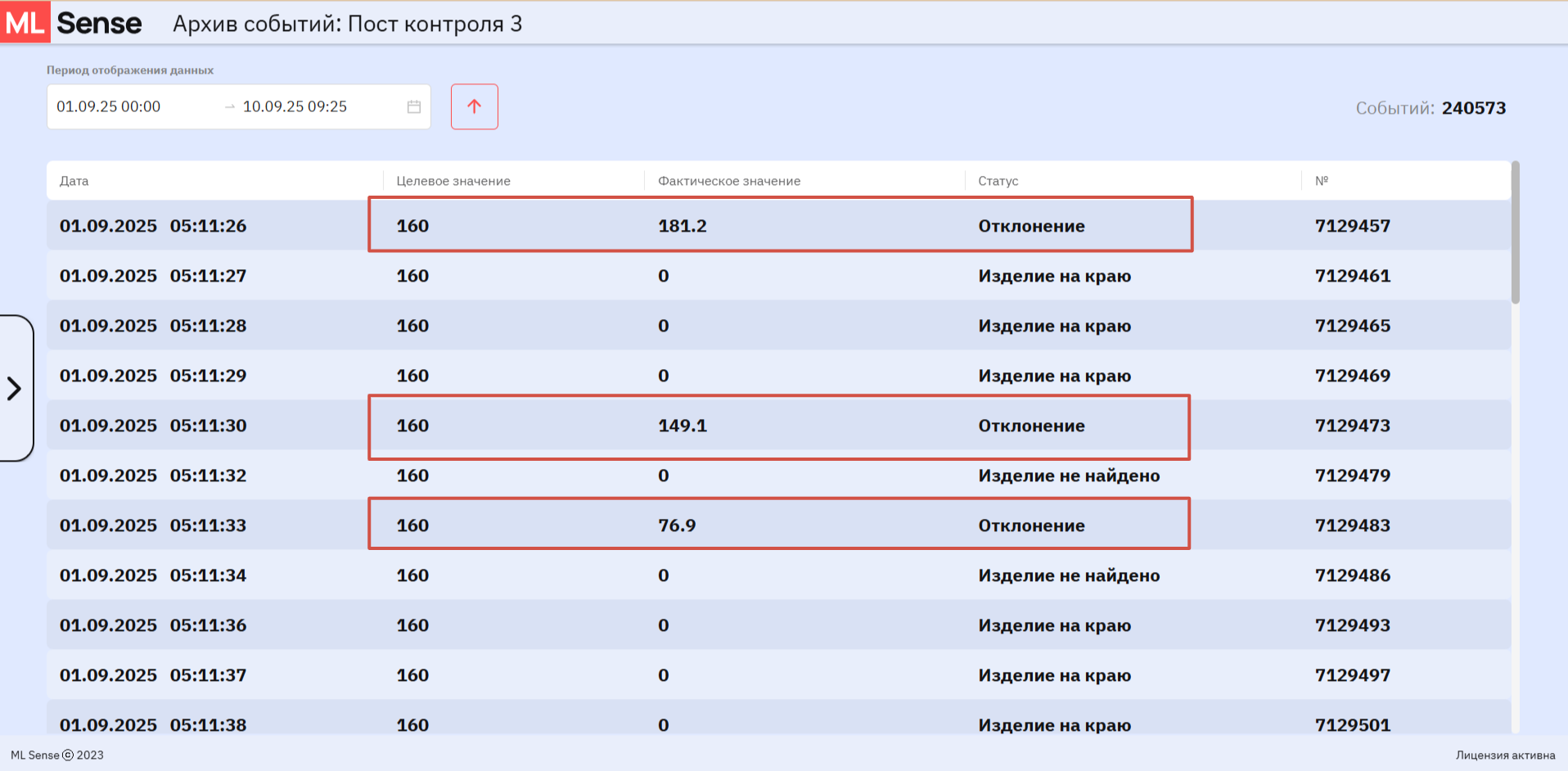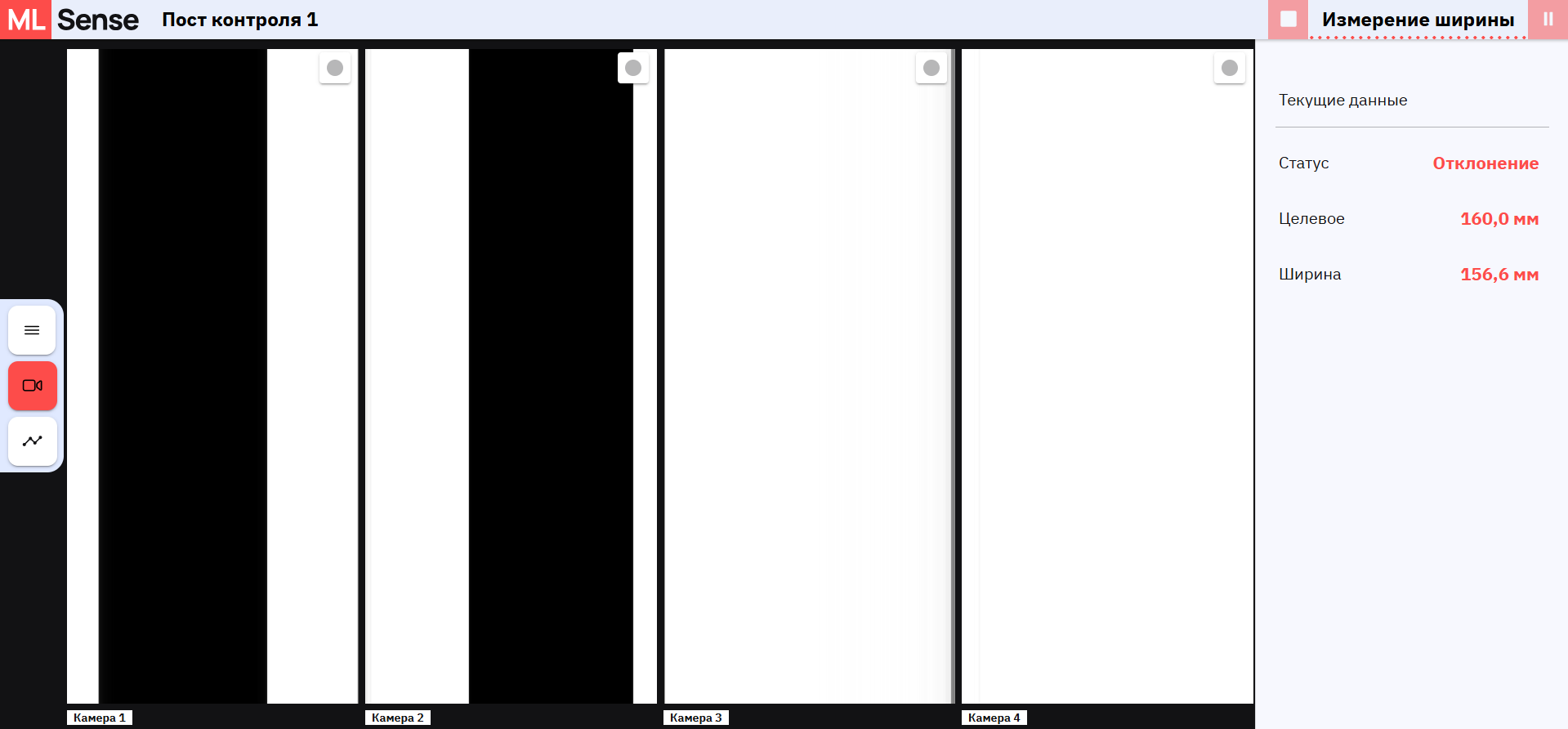 ML Sense определяет границы изделия по «чёрным пикселям» и преобразует полученные значения в миллиметры с учётом калибровки и дисторсии камеры. Если ширина выходит за пределы допуска, то на светозвуковой колонне загорается соответствующий цвет: