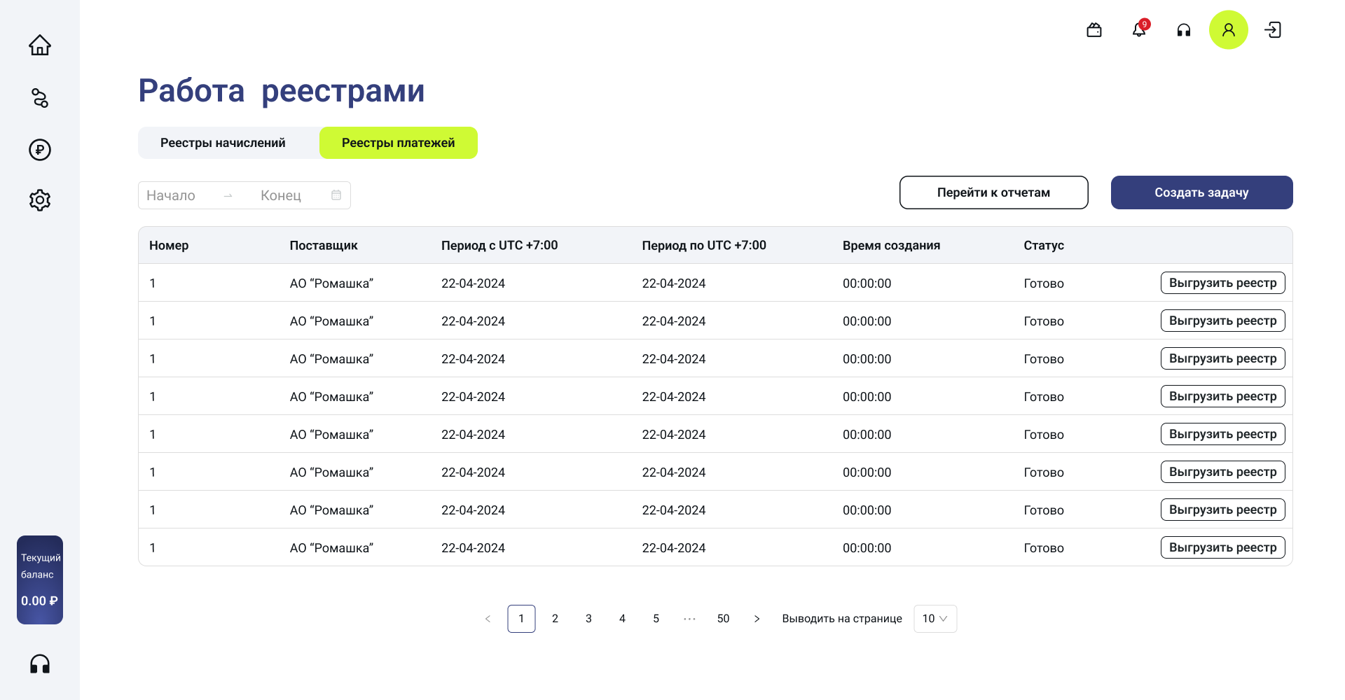 В личном кабинете реализован модуль работы с реестрами начислений и платежей. Реестр показывает все операции по абонентам: начисления за услуги, оплаты, задолженности.