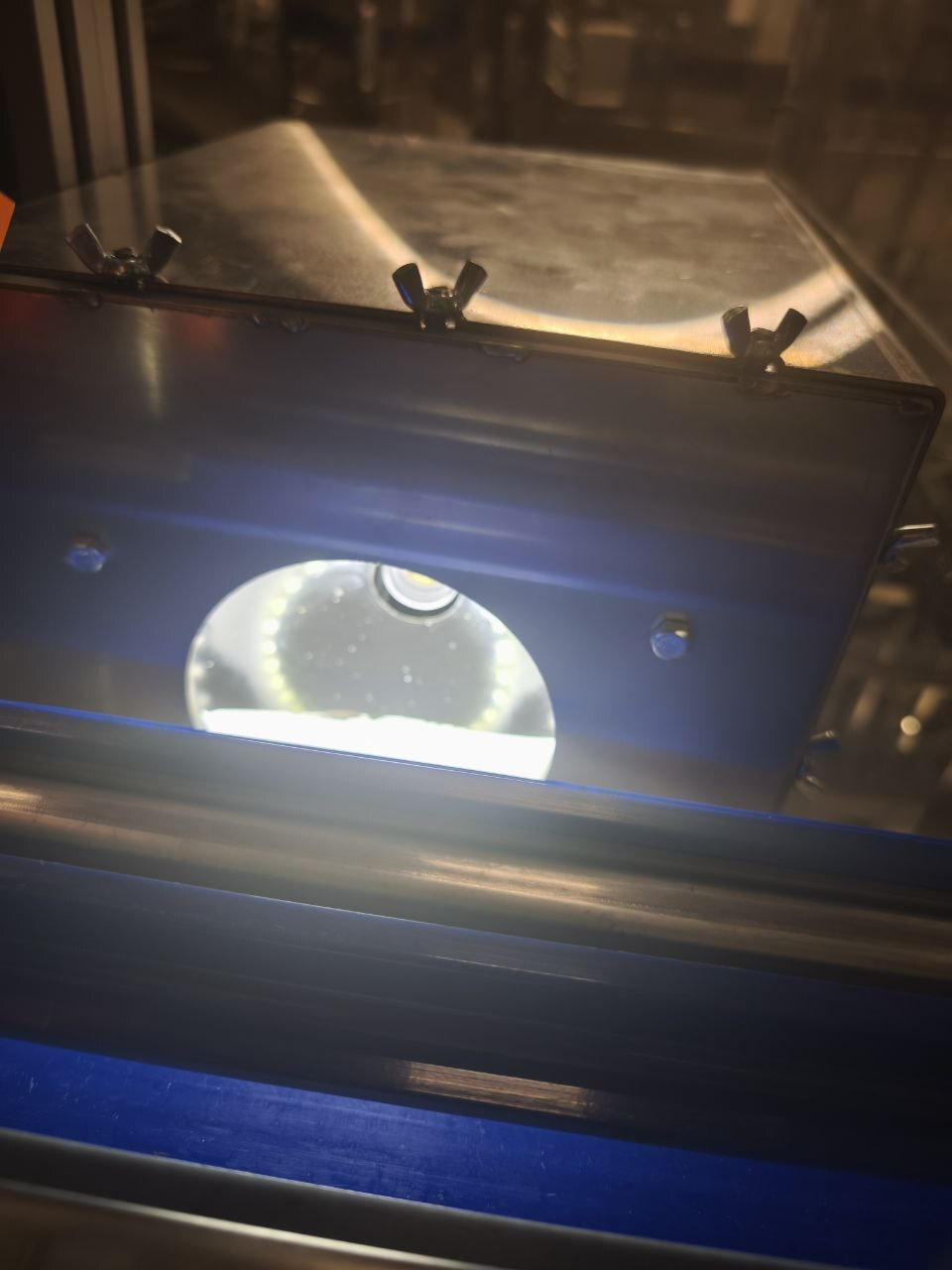 Камера машинного зрения размещена в защищённом кожухе с купольным освещением — такая конструкция позволяет получать качественные изображения и минимизирует влияние бликов. Камера установлена на стабилизированном основании, которое компенсирует вибрации конвейера и сохраняет точность распознавания даже при максимальной скорости линии.