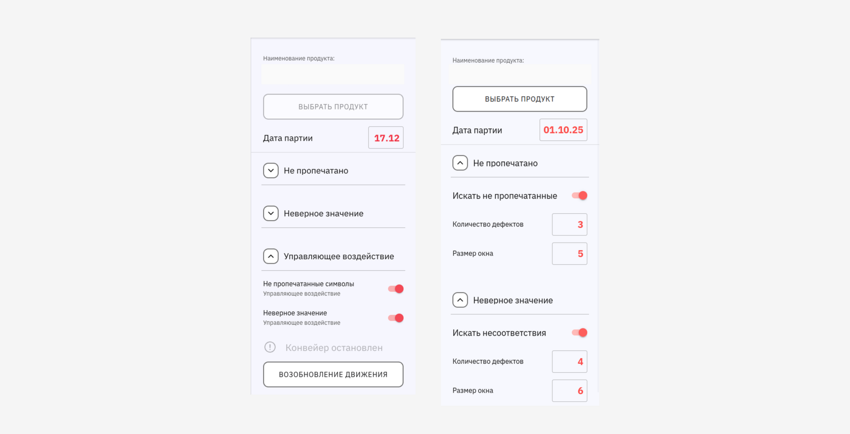Перед запуском линии оператор выбирает тип продукции и вводит параметры партии: дату розлива, срок годности и шаблон маркировки. Эти данные становятся эталоном для проверки каждой банки.