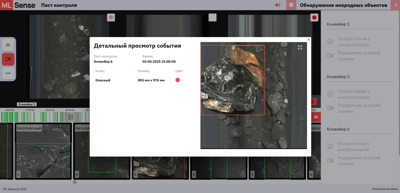 Отдельный вызов — требования к скорости реакции. На двух из трёх линий зона обзора камеры ограничена — с момента появления тела до зоны дробилки проходит менее секунды. Стандартные алгоритмы ML Sense были оптимизированы под эти условия, обеспечивая молниеносное обнаружение и отправку сигнала на остановку.