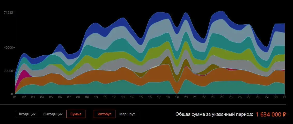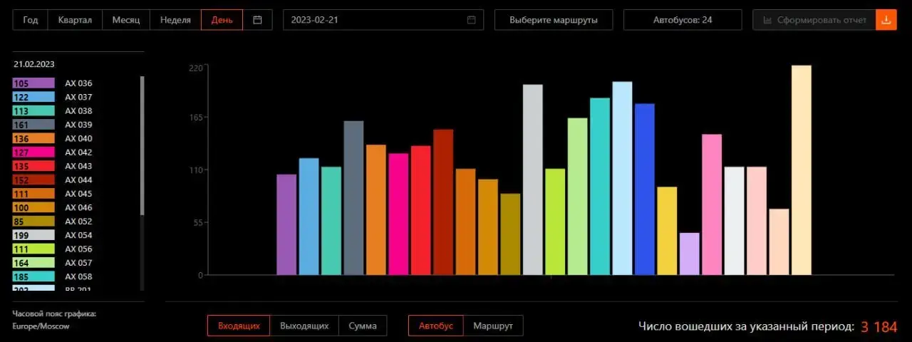 В интерфейсе программы владелец автопарка видит количество пассажиров с точностью до остановки, выручку по выбранному автобусу или всему автопарку, график изменения выручки за месяц. Также можно посмотреть загруженность маршрута по дням недели и времени. Если возникает спорный случай, то можно просмотреть видео запись из салона в указанный промежуток времени, что соответствует требования безопасности по ПП969.