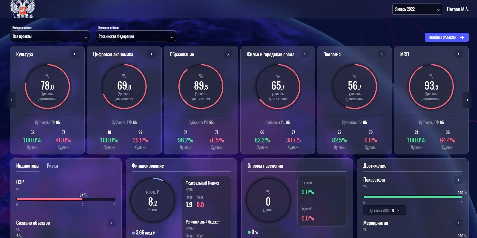 Разработка современного интерактивного дашборда с актуальной информацией по каждому проекту решила проблему контроля реализации инициатив по всей территории РФ, а также ускорила рассмотрение отчетов представителями власти