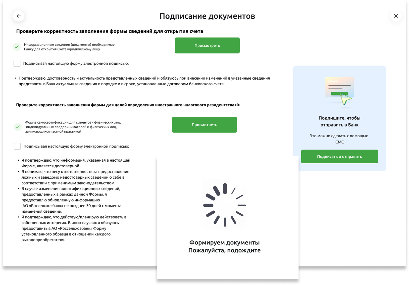 Затем пользователь возвращается в веб-интерфейс банка. Здесь он видит предзаполненную заявку — всё, что можно было получить из внешних источников, уже внесено. Это значительно упрощает процесс. Далее идёт этап самосертификации: клиент вручную подтверждает или дополняет юридически значимые сведения — адрес, статус резидентства, паспортные данные, сведения об учредителях, планируемые финансовые операции. Без этих подтверждений процесс не может быть завершён.