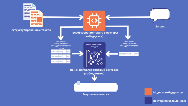 Мы использовали векторный поиск, который сохраняет смысл запроса, ориентируясь не только на ключевые слова. Традиционные поисковые системы ищут точное совпадение по ключевым словам. Векторный поиск, напротив, работает с векторными представлениями данных – числами, отражающими смысл текста.