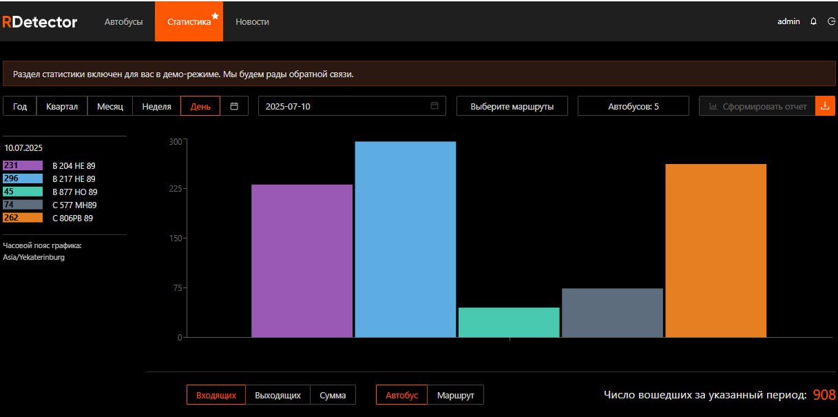 Система RDetector передаёт данные о пассажиропотоке в режиме онлайн. В личном кабинете диспетчера доступны: