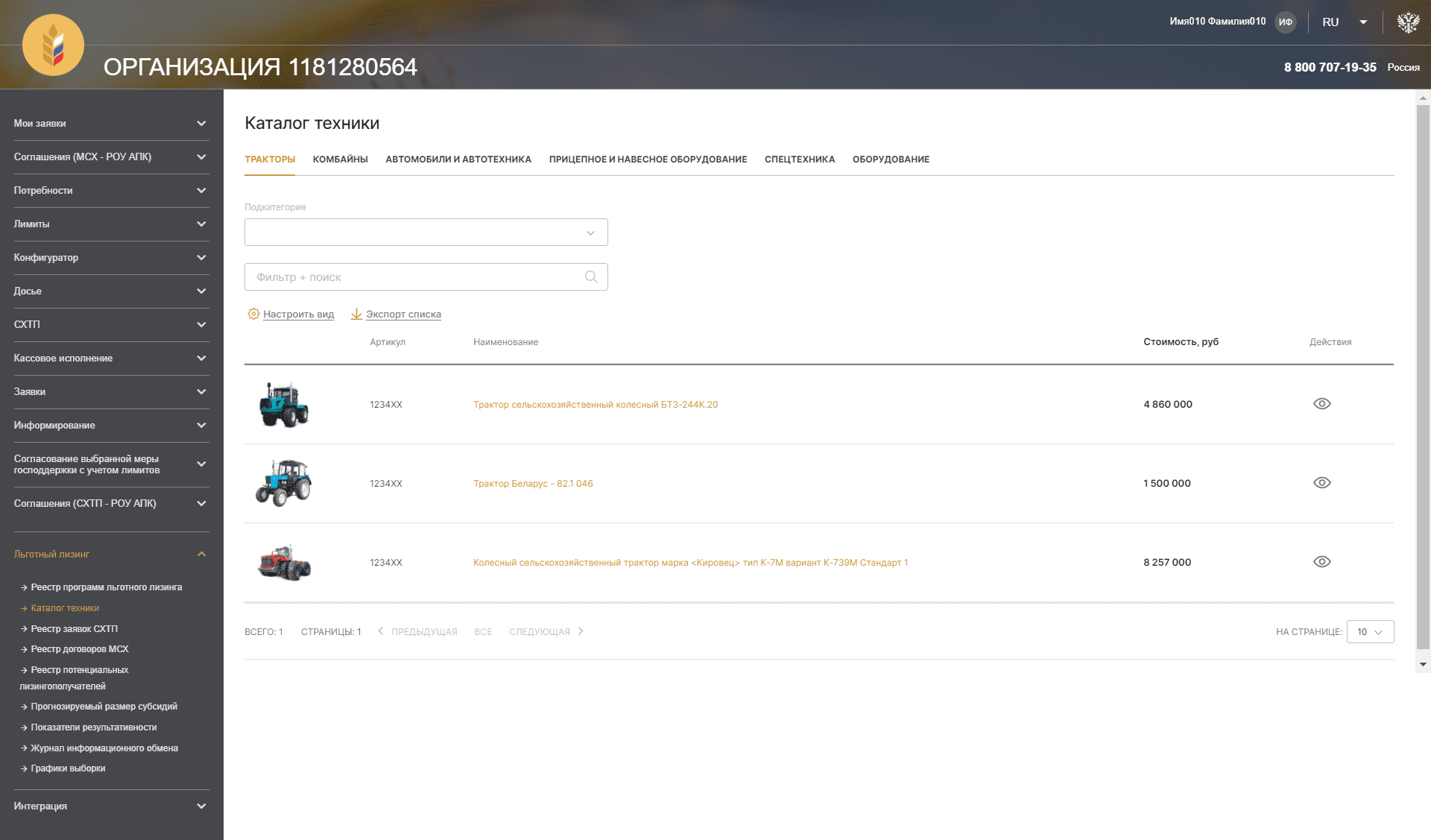 Отображение актуальной информации из нескольких баз данных: доступная техника, субсидии, формы документов с возможностью сортировки и фильтрации;
