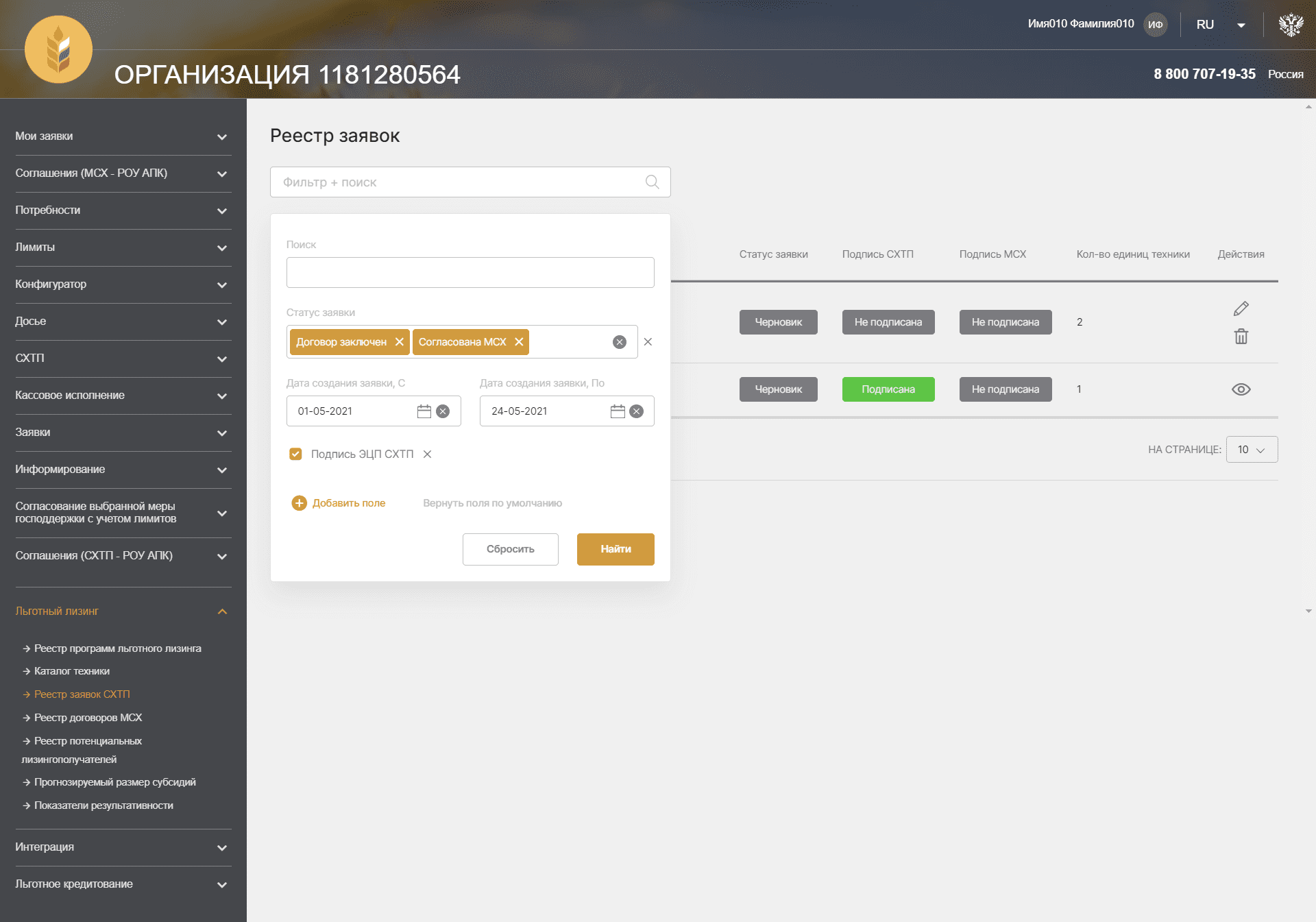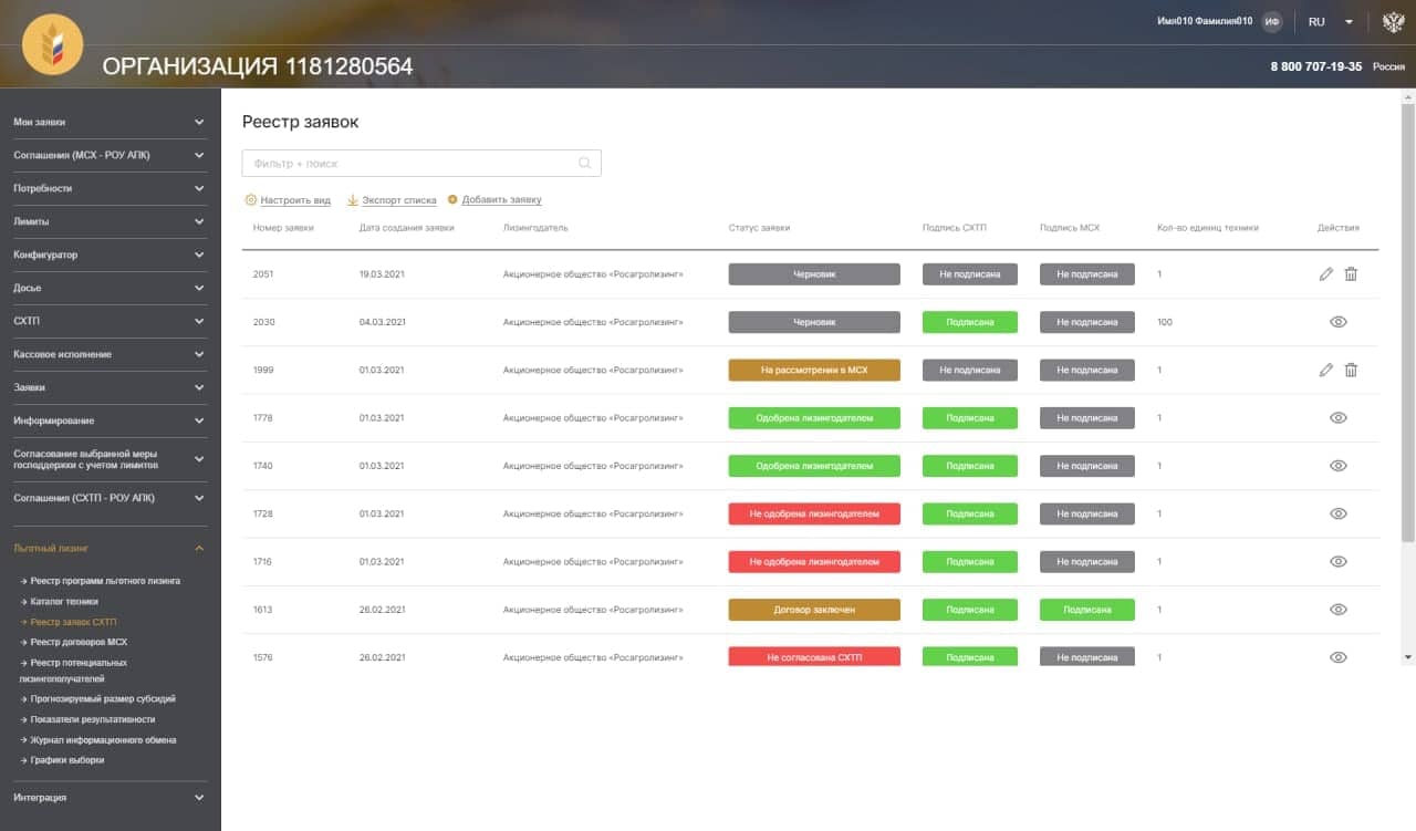 Настройка кабинетов пользователей: аграрию, представителю АПК или лизинговой компании автоматически отображаются релевантные поля внутри кабинета;