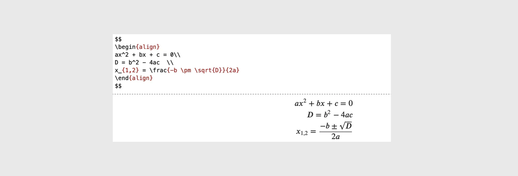 Сверху — математические выражения в виде кода LaTeX, внизу — привычная нам запись
