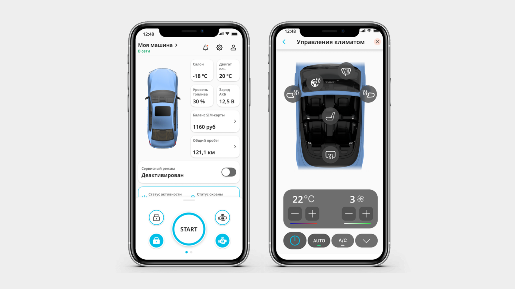 Приложение работает с установленными модулями автомобиля и обеспечивает удобный и безопасный контроль машины в любое время и из любой точки
